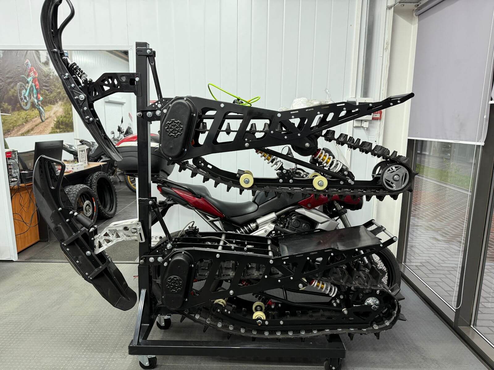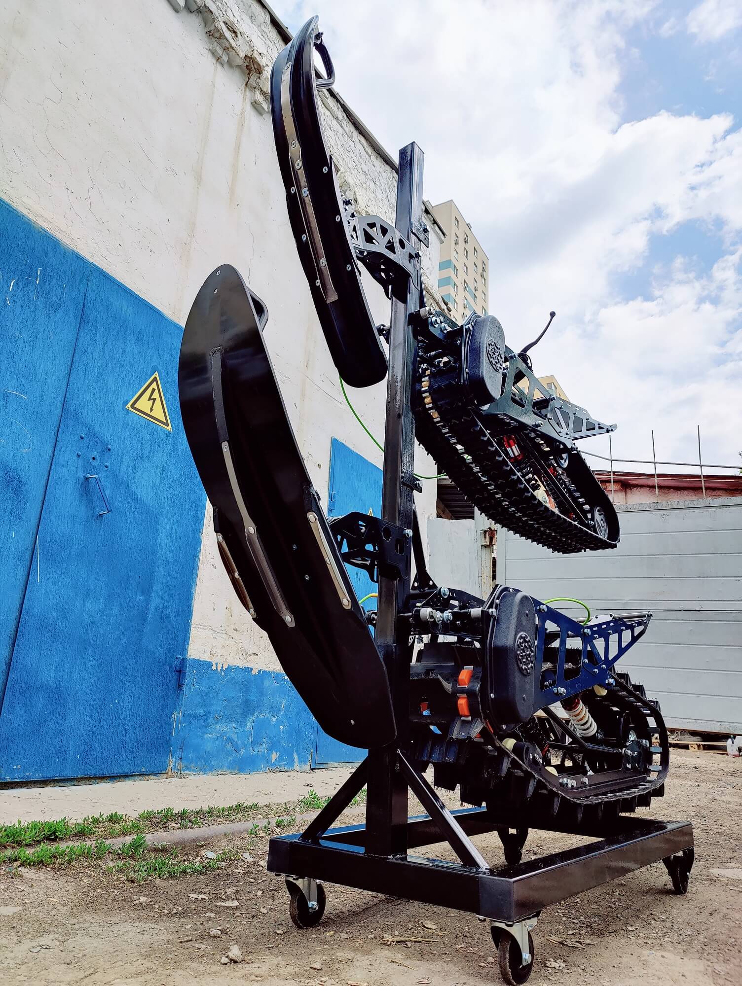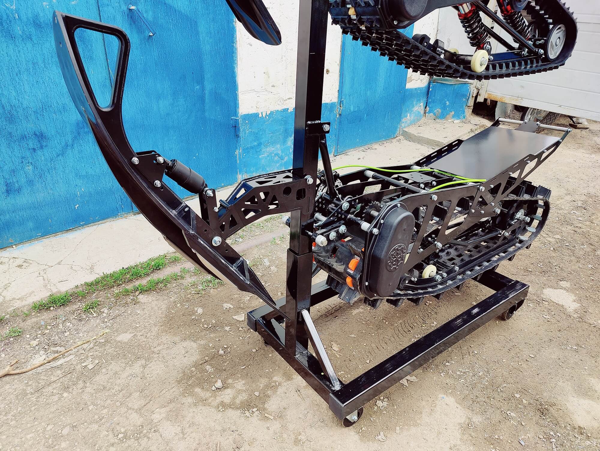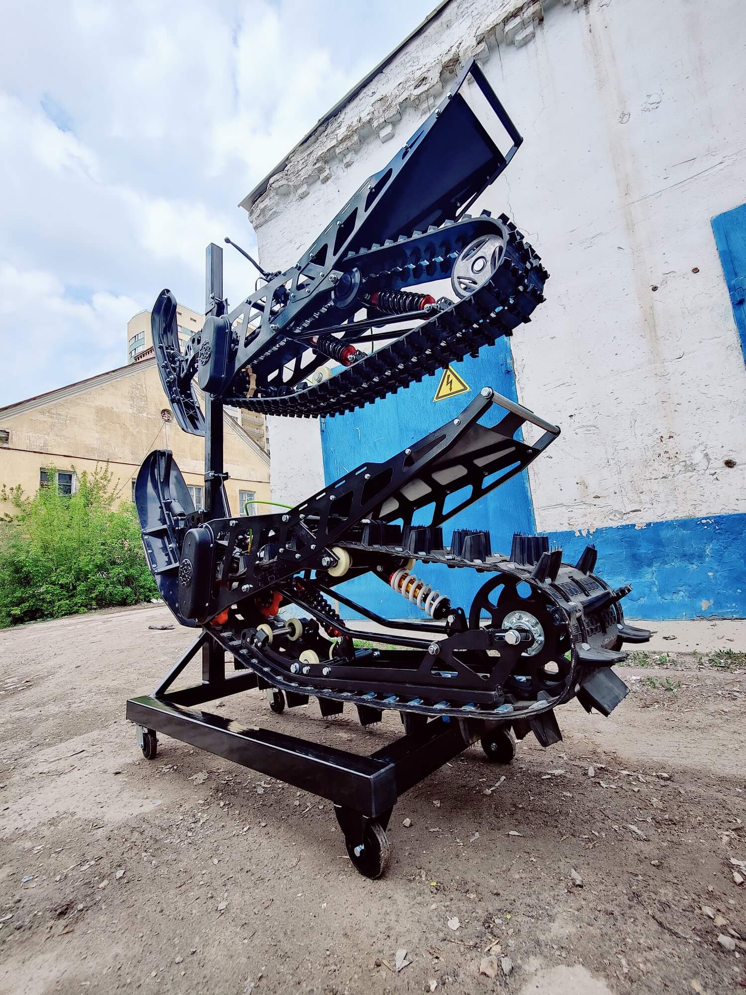 Разборный демонстрационный стенд для гусеничных комплектов Monotrack в магазин. Конструкция стальная. Передние катки вращающиеся со стопором, задние фиксированные. Позволяют установить два комплекта друг над другом.