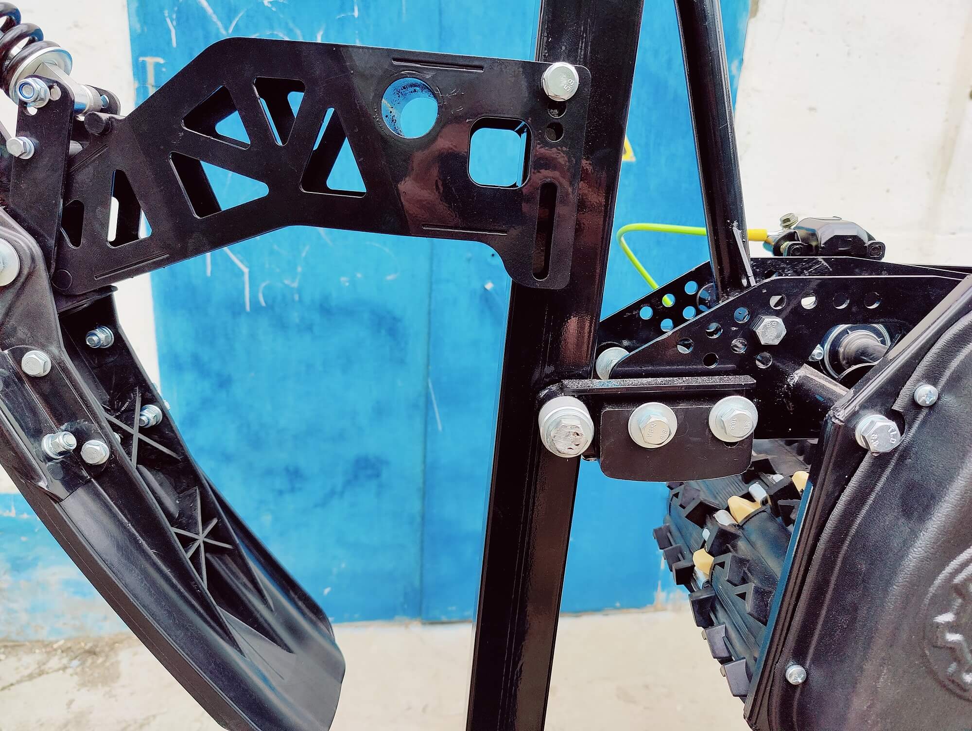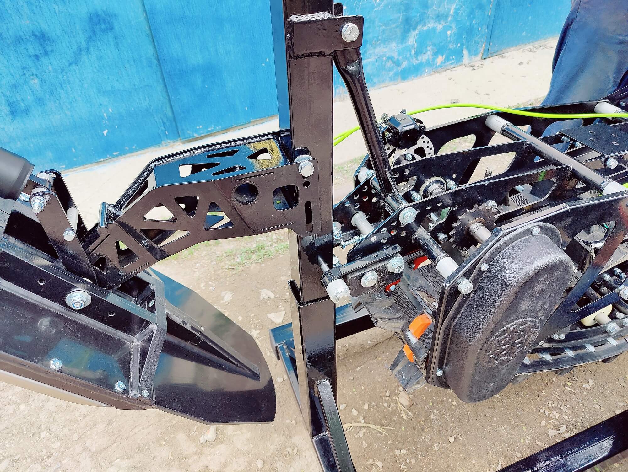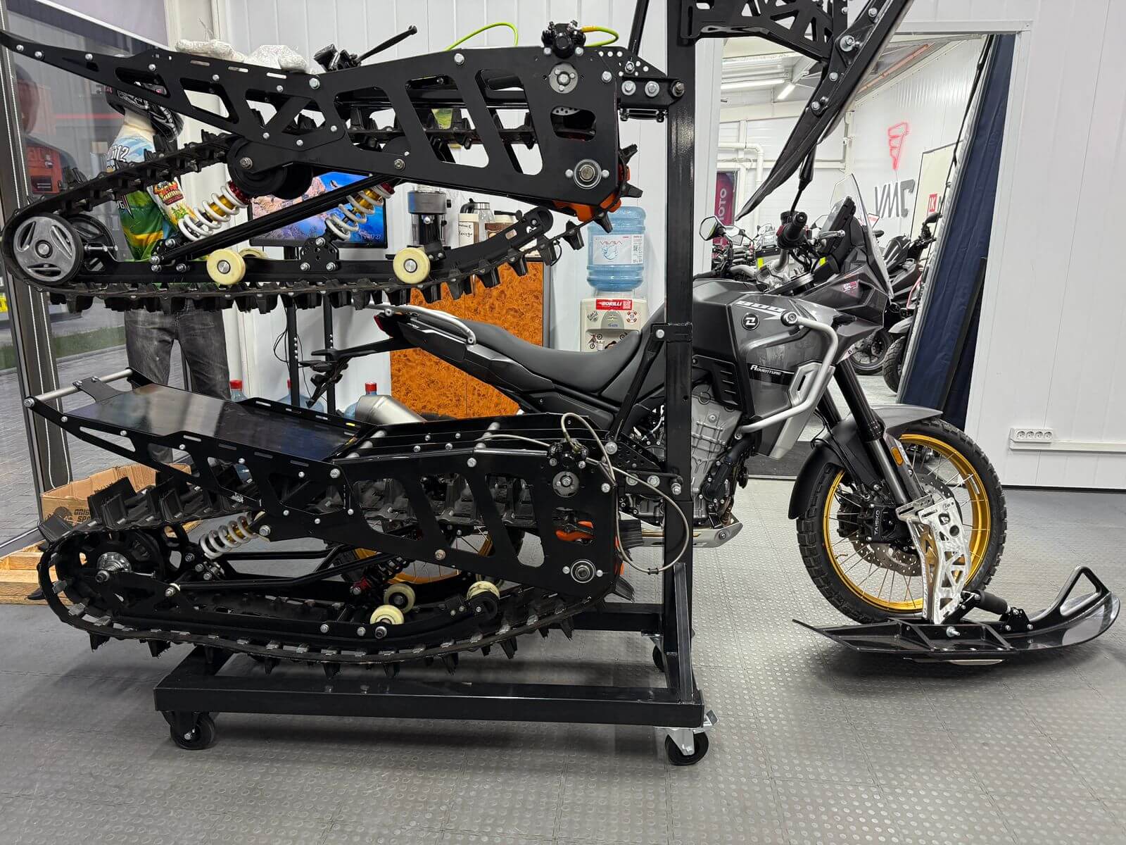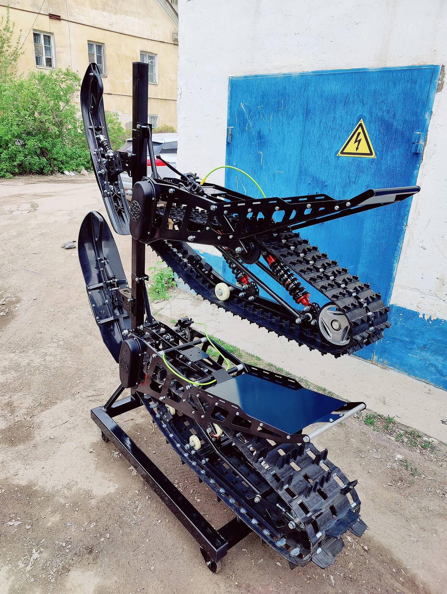 Разборный демонстрационный стенд для гусеничных комплектов Monotrack в магазин. Конструкция стальная. Передние катки вращающиеся со стопором, задние фиксированные. Позволяют установить два комплекта друг над другом.