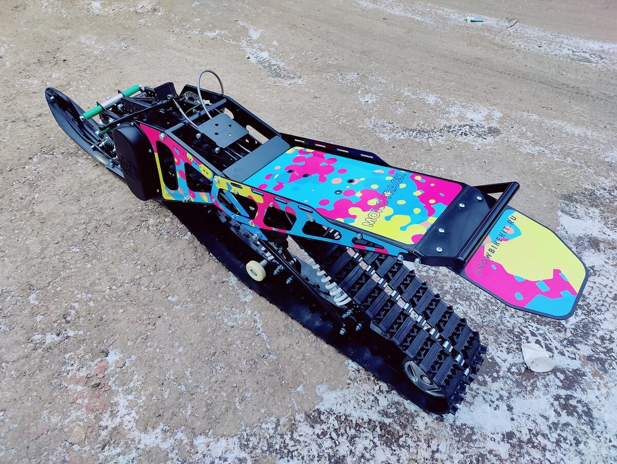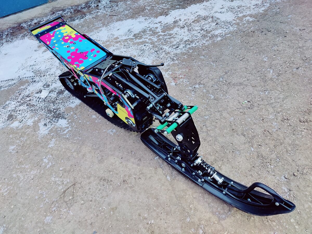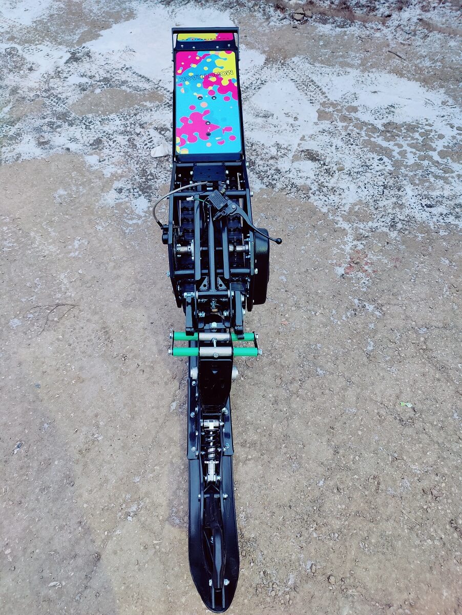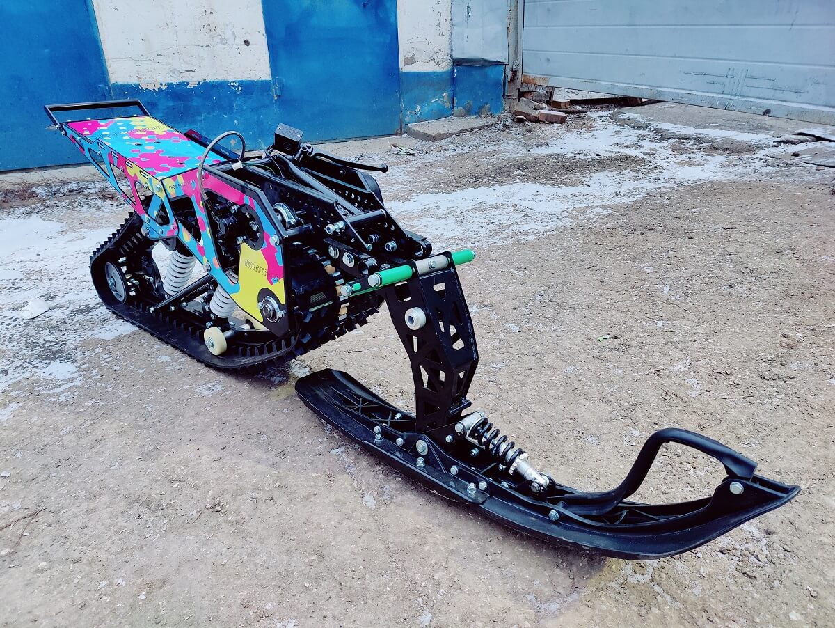 - боковые коньки лыжи под 45 градусов, что позволяет более эффективно удерживать сноубайк в повороте при наклоне