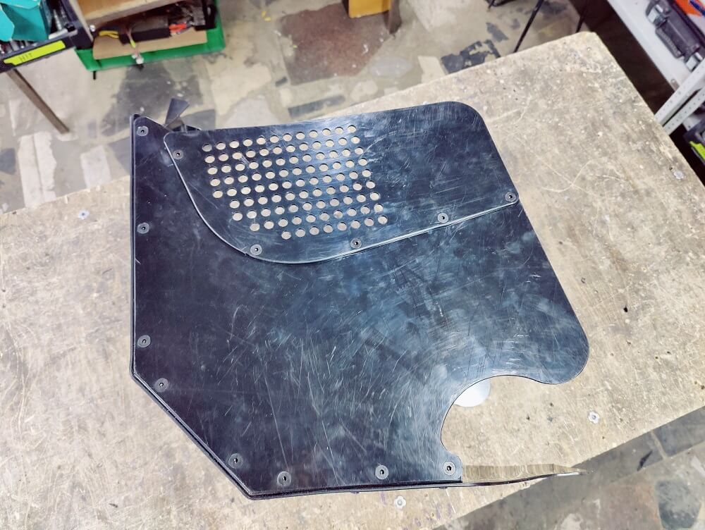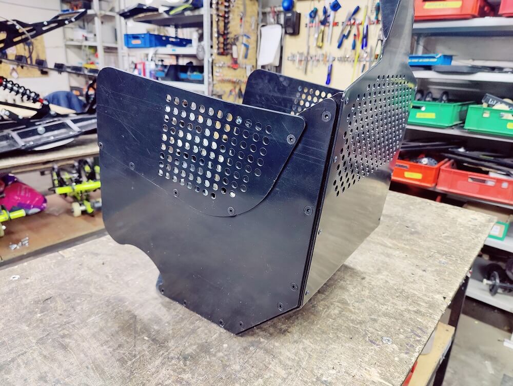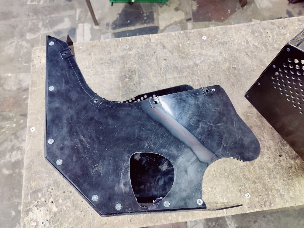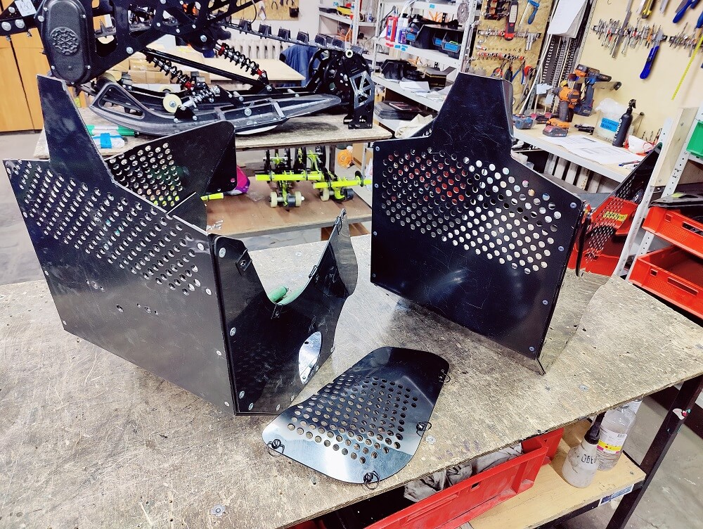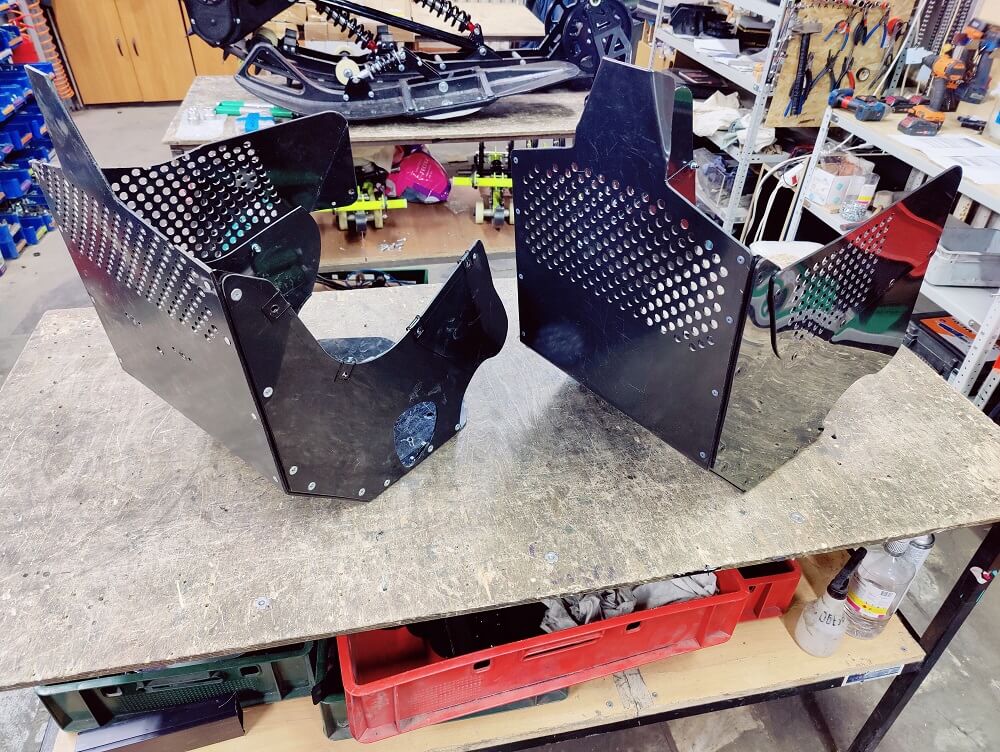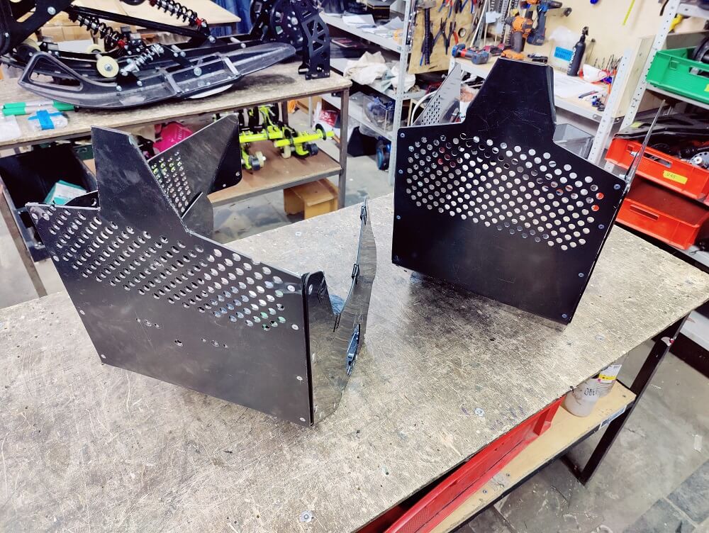 Специально не делаем вырез под ножку переключение передач в левой стенке, оставляем ее цельной, поскольку на разных мотоциклах ножки могут отличаться по длине, плюс кто-то дорабатывает под зимние ботинки (как мы). Подскажем как правильно вырезать отверстие под ножку чтобы было аккуратно и не попадал снег.