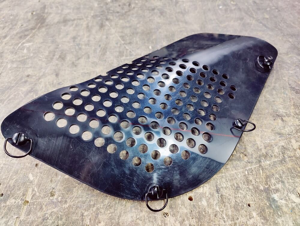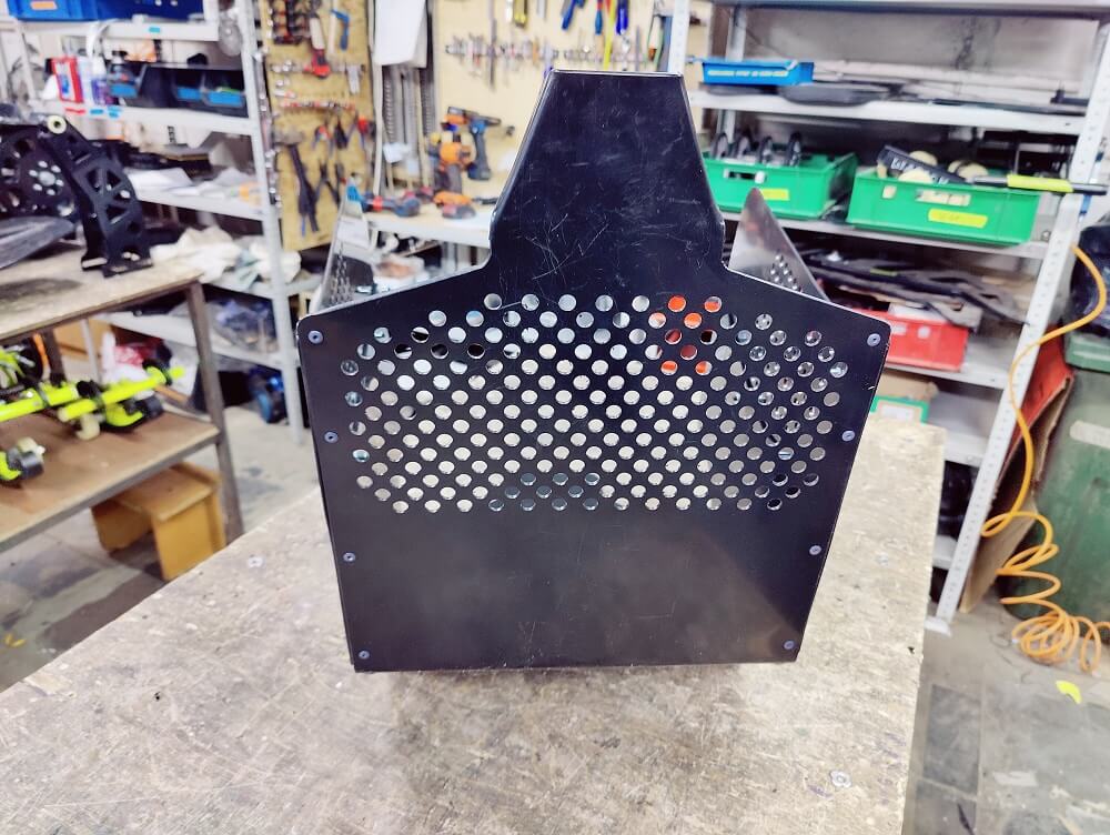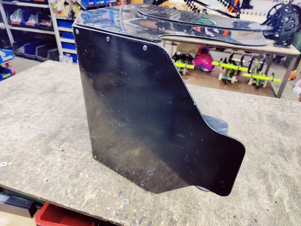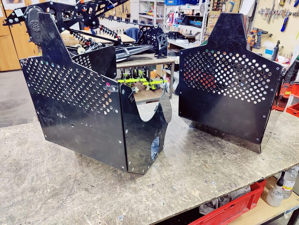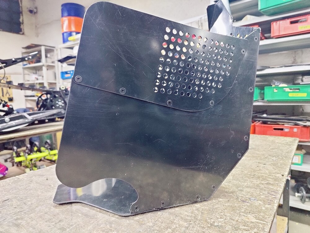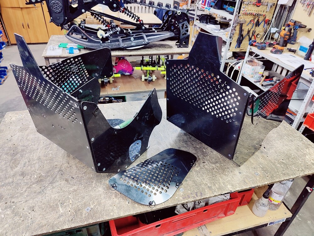 На кожух можно нанести яркие наклейки с лого. Кожух выполнен из гибкого ПНД пластика 3 мм, который не только можно формовать под профиль рамы с помощью фена но и легко обрезать электро лобзиком или даже ножом. На стенках и передней части есть вентидяционные отверстия, которые кстати можно закрыть в «powder day».