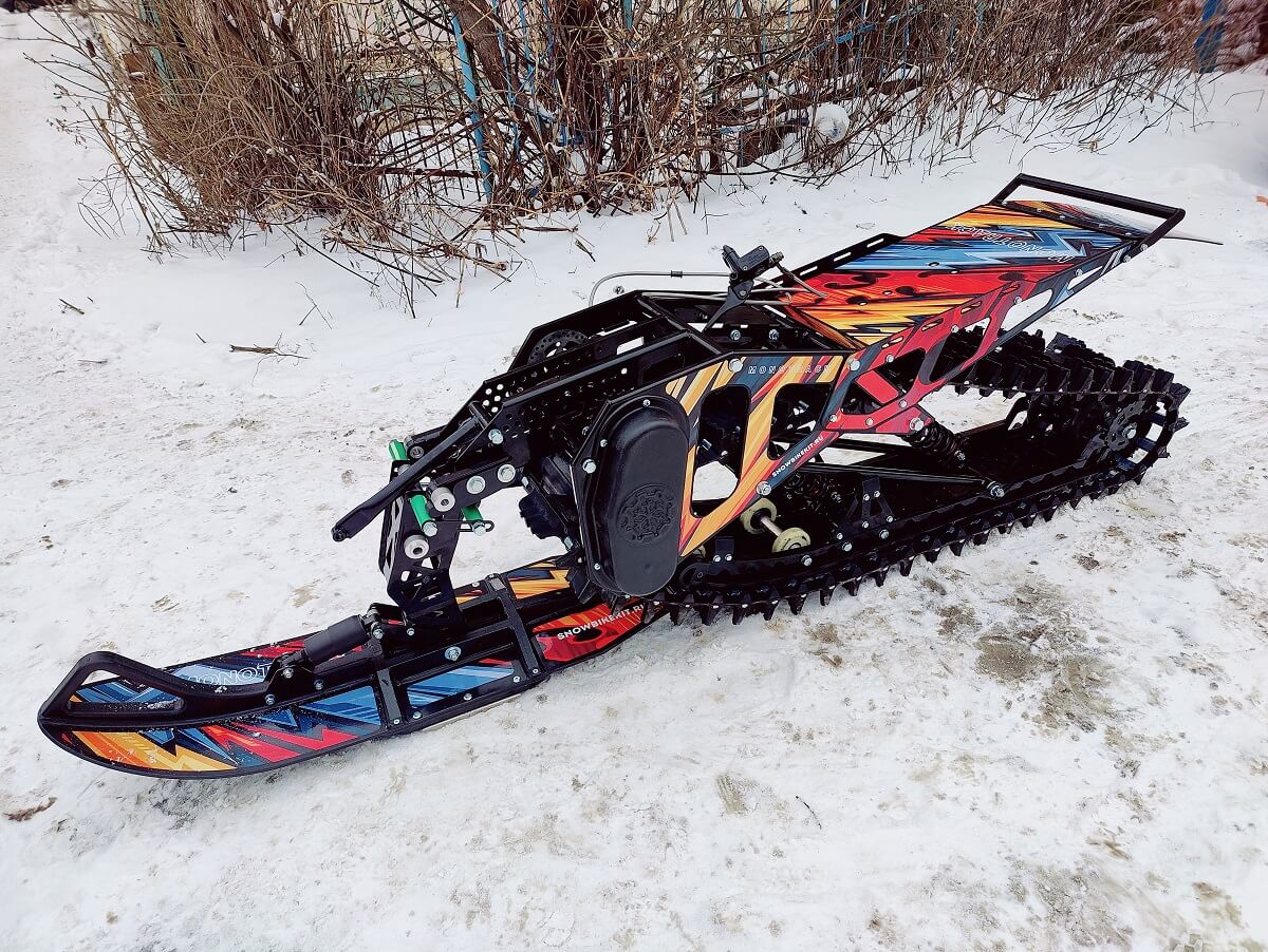 - боковые коньки лыжи под 45 градусов, что позволяет более эффективно удерживать сноубайк в повороте при наклоне