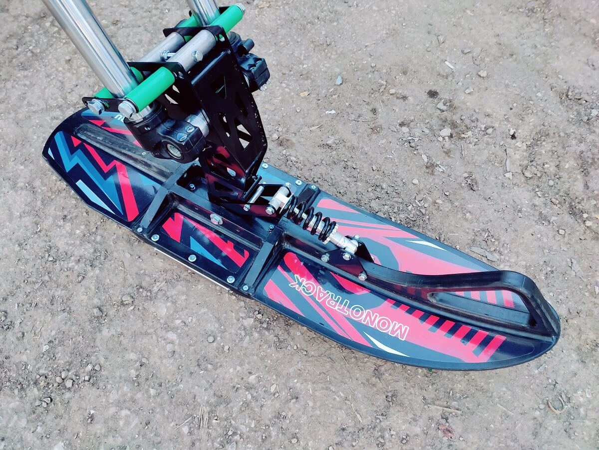 - боковые коньки лыжи под 45 градусов, что позволяет более эффективно удерживать сноубайк в повороте при наклоне